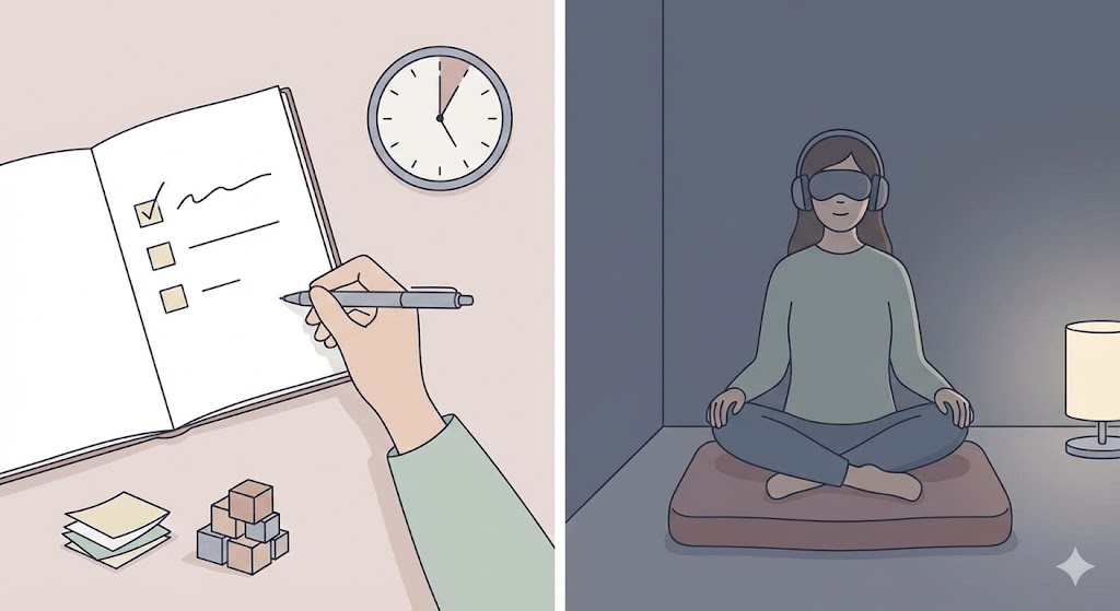 休息の時間は、「感覚を遮断する」ことを意識してください。 ノイズキャンセリングイヤホンで静寂を作ったり、照明を落とした部屋でアイマスクをして横になったりする。外部からの情報を一切入れず、自分だけの殻に閉じこもる時間が、あなたの枯渇したエネルギーを回復させます。